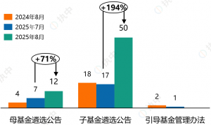 与2025年7月数据相比,母基金遴选公告的数量增加5条,子基金遴选公告的数量增加33条,引导基金管理办法较2025年7月减少1条。与2024年8月数据相比,除引导基金管理办法减少外,母基金遴选公告和子基金遴选公告均出现增加。